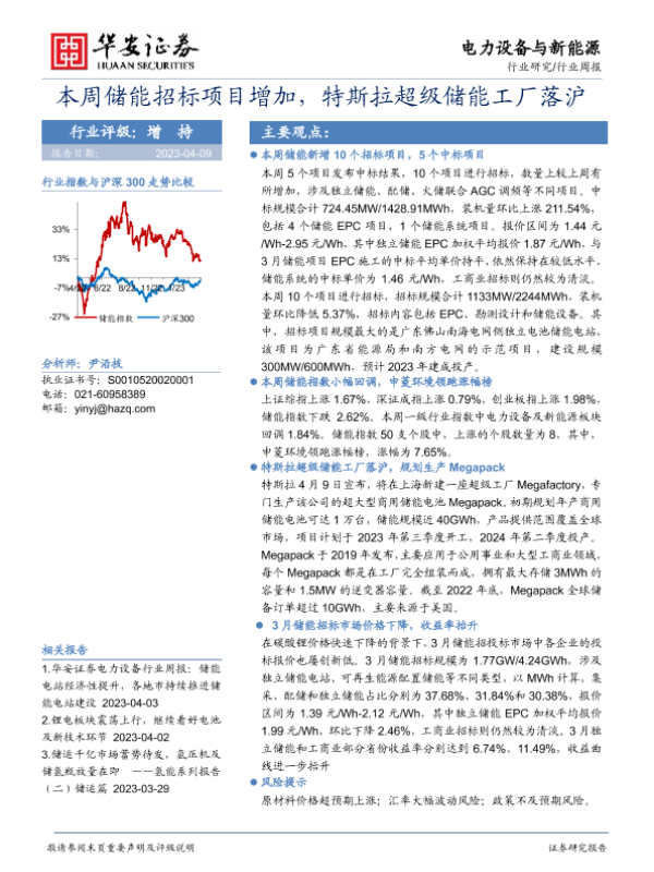 【华安证券】【20230409】20230409-华安证券-电力设备与新能源行业周报:本周储能招标项目增加,特斯拉超级储能工厂落沪-15页