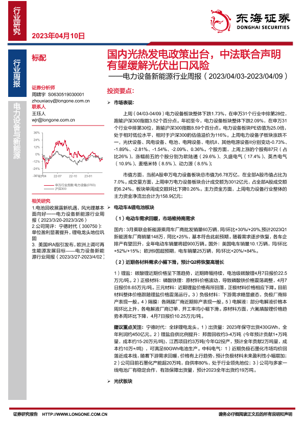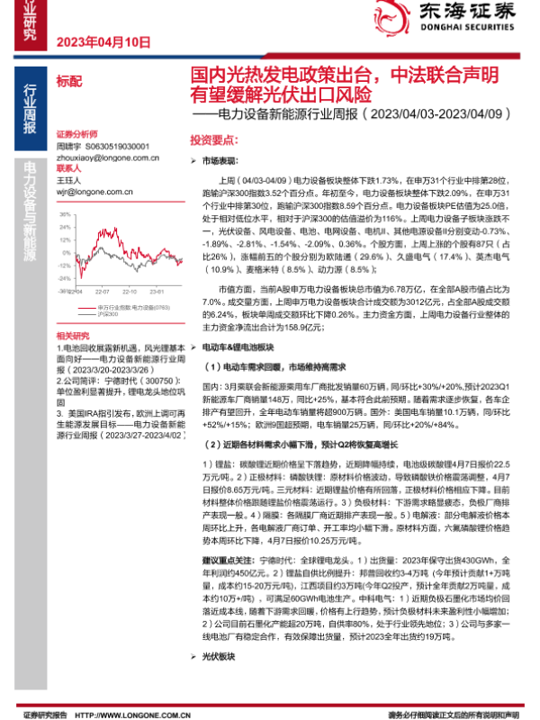 【东海证券】【20230410】20230410-东海证券-电力设备新能源行业周报:国内光热发电政策出台,中法联合声明有望缓解光伏出口风险-32页