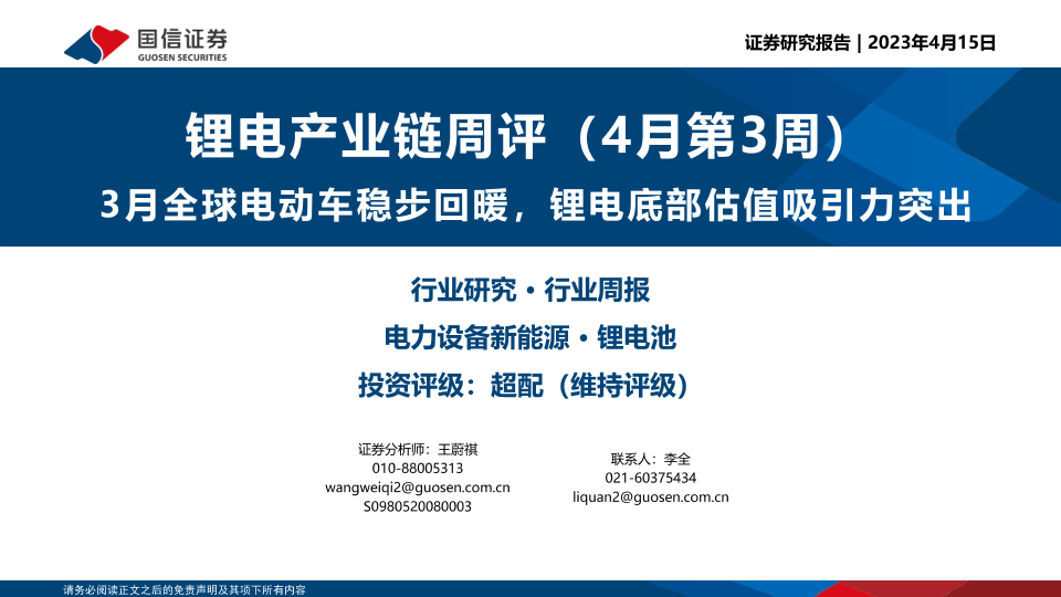 【国信证券】【20230415】锂电产业链周评(4月第3周):3月全球电动车稳步回暖,锂电底部估值吸引力突出-17页