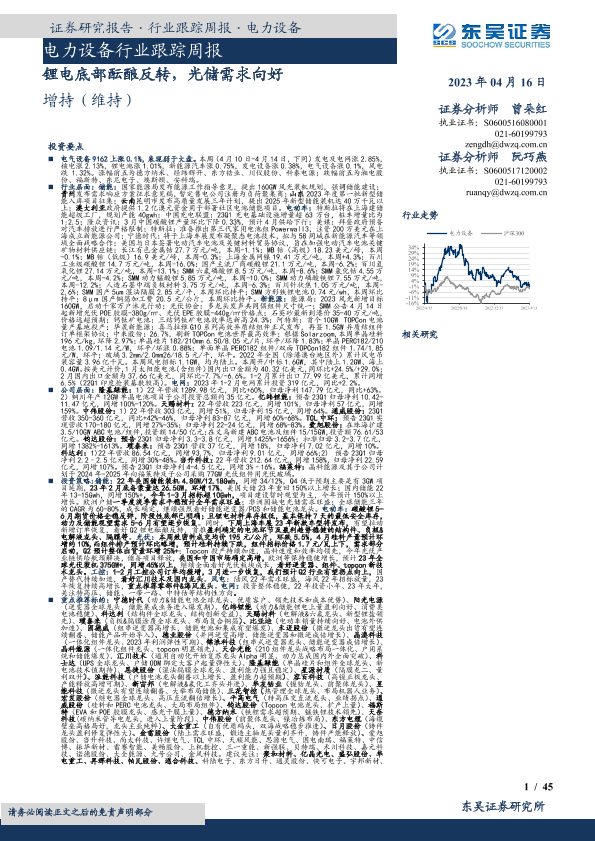 【东吴证券】【20230416】电力设备行业跟踪周报:锂电底部酝酿反转,光储需求向好-45页