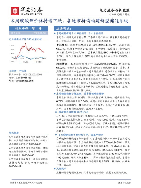 【华安证券】【20230416】20230416-华安证券-电力设备与新能源行业周报:本周碳酸锂价格持续下跌,各地市持续构建新型储能系统-17页