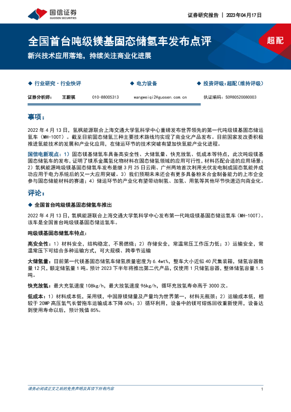 【国信证券】【20230417】全国首台吨级镁基固态储氢车发布点评-新兴技术应用落地,持续关注商业化进展-10页