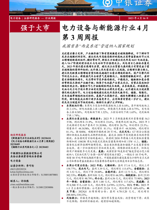 【中银证券】【20230416】电力设备与新能源行业4月第3周周报:我国首条“西氢东送”管道纳入国家规划-16页