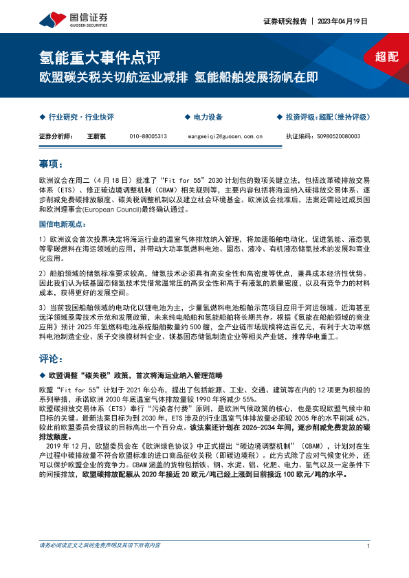 【国信证券】【20230419】氢能重大事件点评:欧盟碳关税关切航运业减排,氢能船舶发展扬帆在即-12页