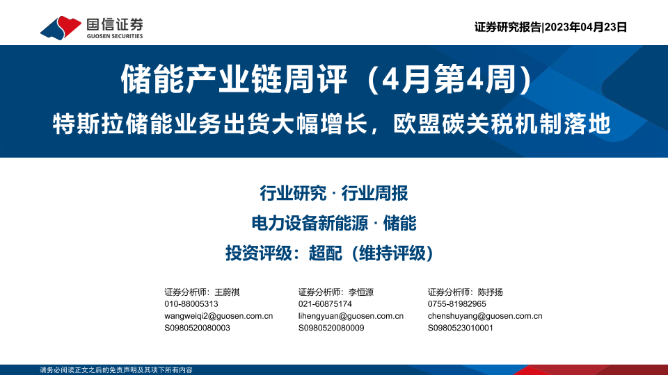 【国信证券】【20230423】20230423-国信证券-储能产业链周评(4月第4周):特斯拉储能业务出货大幅增长,欧盟碳关税机制落地-31页