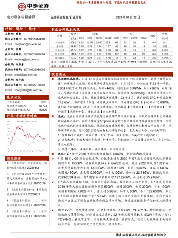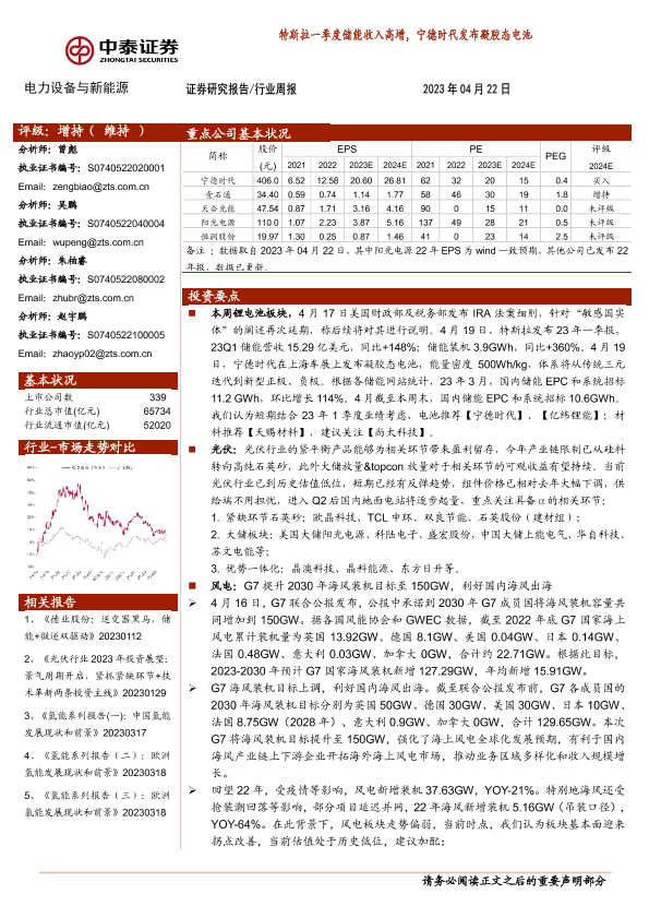 【中泰证券】【20230422】20230422-中泰证券-电力设备与新能源行业周报:特斯拉一季度储能收入高增,宁德时代发布凝胶态电池-31页