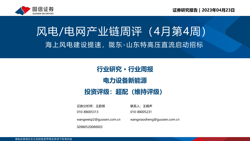 【国信证券】【20230423】风电/电网产业链周评(4月第4周):海上风电建设提速,陇东-山东特高压直流启动招标-26页