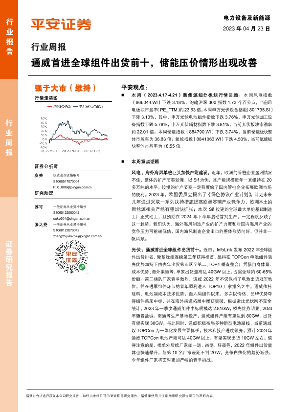 【平安证券】【20230423】电力设备及新能源行业周报:通威首进全球组件出货前十,储能压价情形出现改善-24页