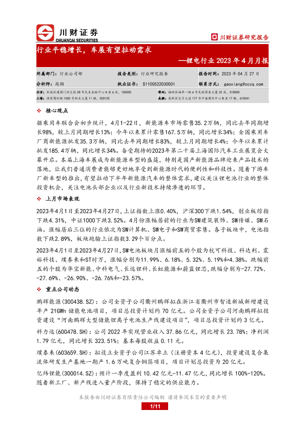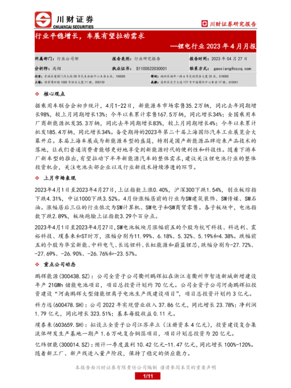 【川财证券】【20230427】锂电行业2023年4月月报:行业平稳增长,车展有望拉动需求-11页