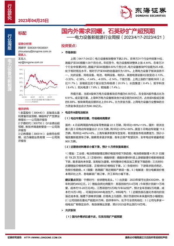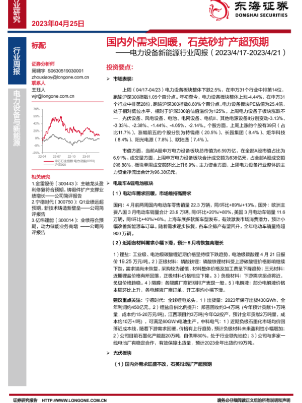 【东海证券】【20230425】电力设备新能源行业周报:国内需求国内外需求回暖,石英砂扩产超预期-33页