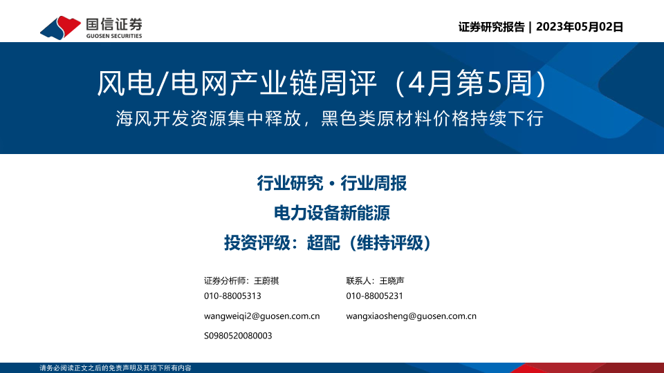 【国信证券】【20230502】风电/电网产业链周评(4月第5周):海风开发资源集中释放,黑色类原材料价格持续下行-26页