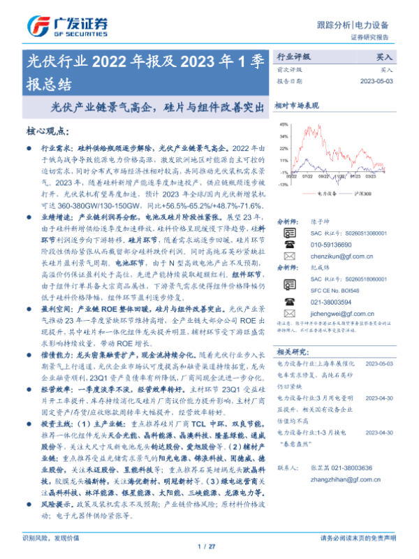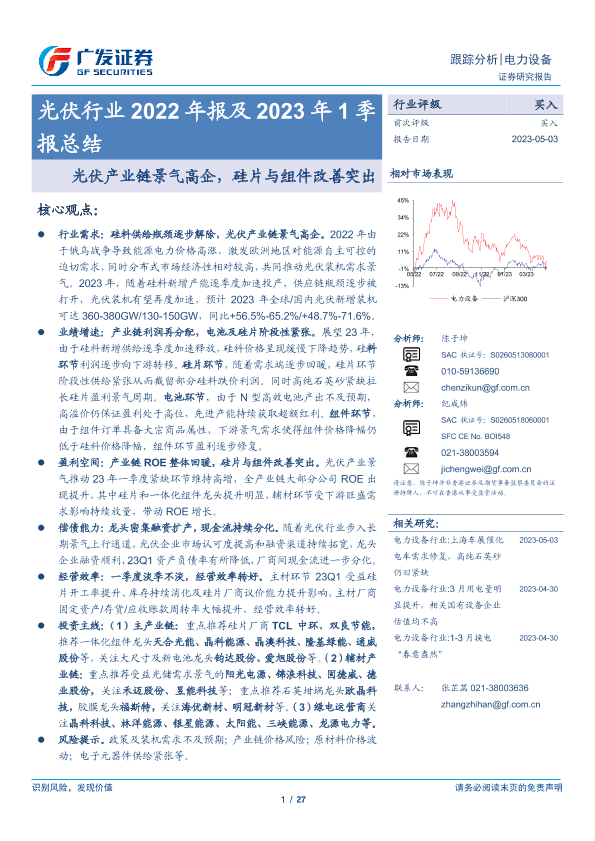 【广发证券】【20230503】光伏行业2022年报及2023年1季报总结:光伏产业链景气高企,硅片与组件改善突出-27页