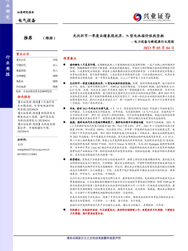 【兴业证券】【20230504】光伏环节一季度业绩表现优异,N型电池溢价依然坚挺——电力设备与新能源行业周报-20页