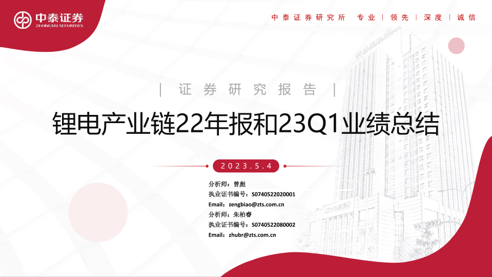 【中泰证券】【20230504】锂电产业链22年报和23Q1业绩总结-17页