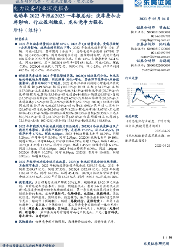 【东吴证券】【20230504】电动车2022年报&2023一季报总结:淡季叠加去库影响,行业盈利触底,龙头竞争力强化-50页