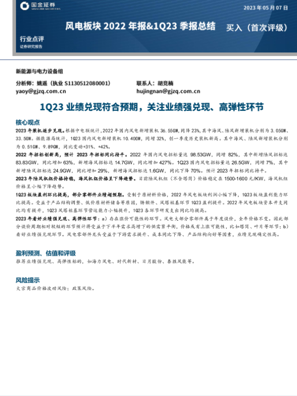 【国金证券】【20230507】风电板块2022年报&1Q23季报总结:1Q23业绩兑现符合预期,关注业绩强兑现、高弹性环节-11页