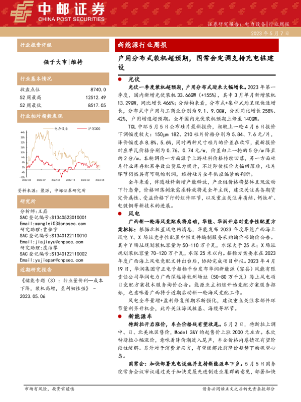【中邮证券】【20230507】20230507-中邮证券-新能源行业周报:户用分布式装机超预期,国常会定调支持充电桩建设-19页