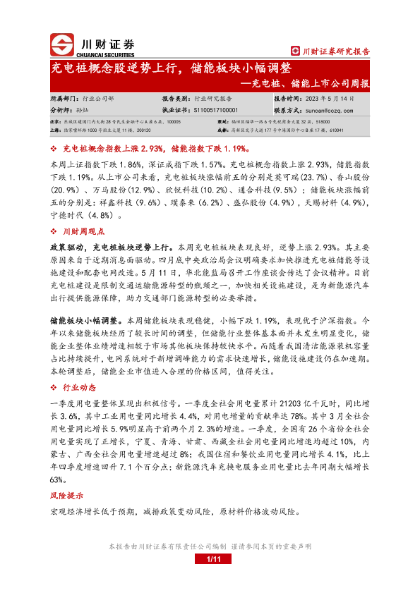 【川财证券】【20230514】充电桩、储能上市公司周报:充电桩概念股逆势上行,储能板块小幅调整-11页