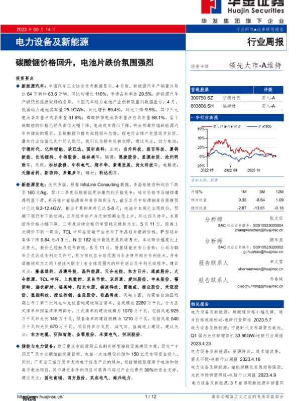 【华金证券】【20230514】电力设备及新能源行业周报:碳酸锂价格回升,电池片跌价氛围强烈-12页