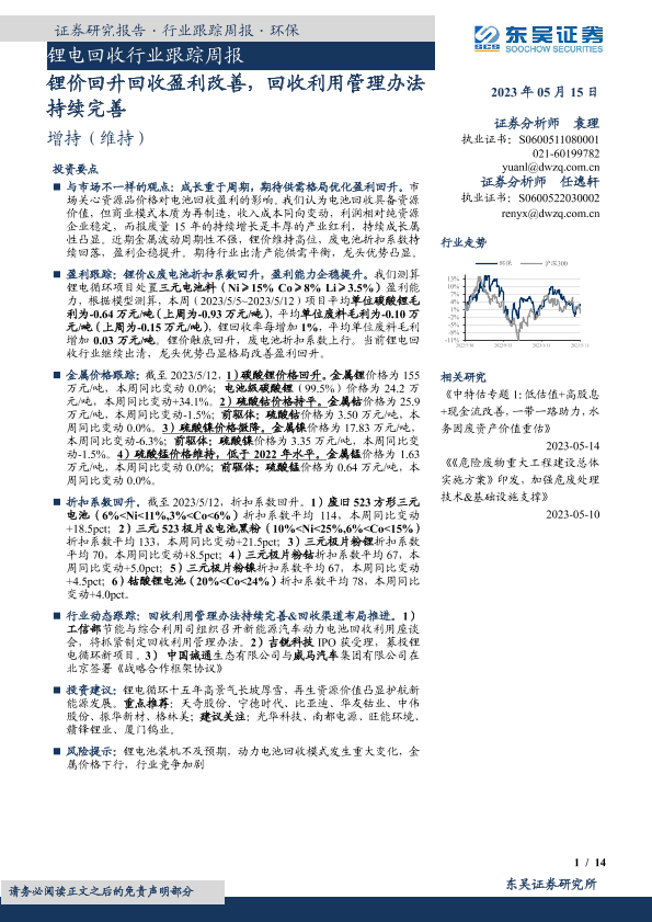 【东吴证券】【20230515】锂电回收行业跟踪周报:锂价回升回收盈利改善,回收利用管理办法持续完善-14页