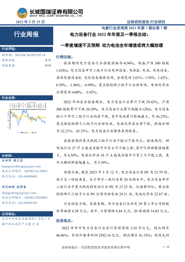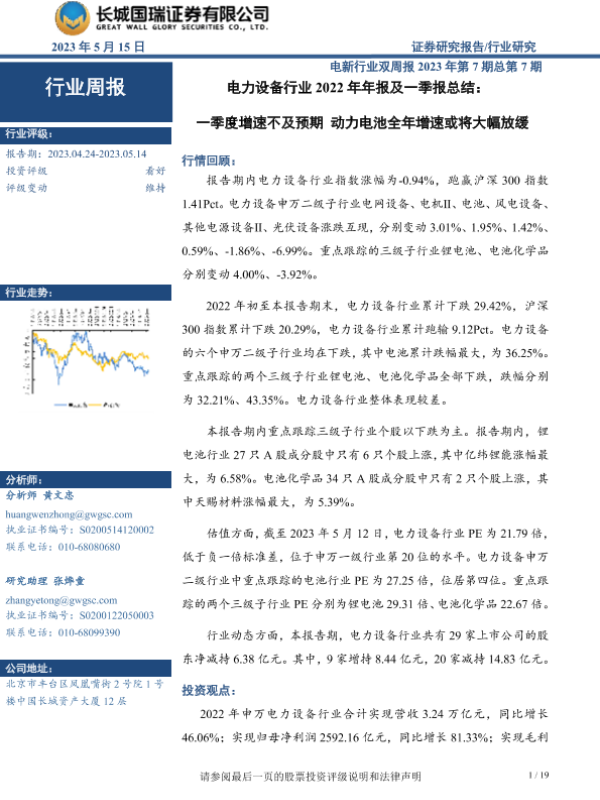 【长城国瑞证券】【20230515】电力设备行业2022年年报及一季报总结:一季度增速不及预期动力电池全年增速或将大幅放缓-19页