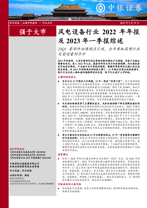 【中银证券】【20230515】风电设备行业2022年年报及2023年一季报综述:23Q1零部件业绩拐点已现,全年装机高增行业有望迎量利齐升-15页