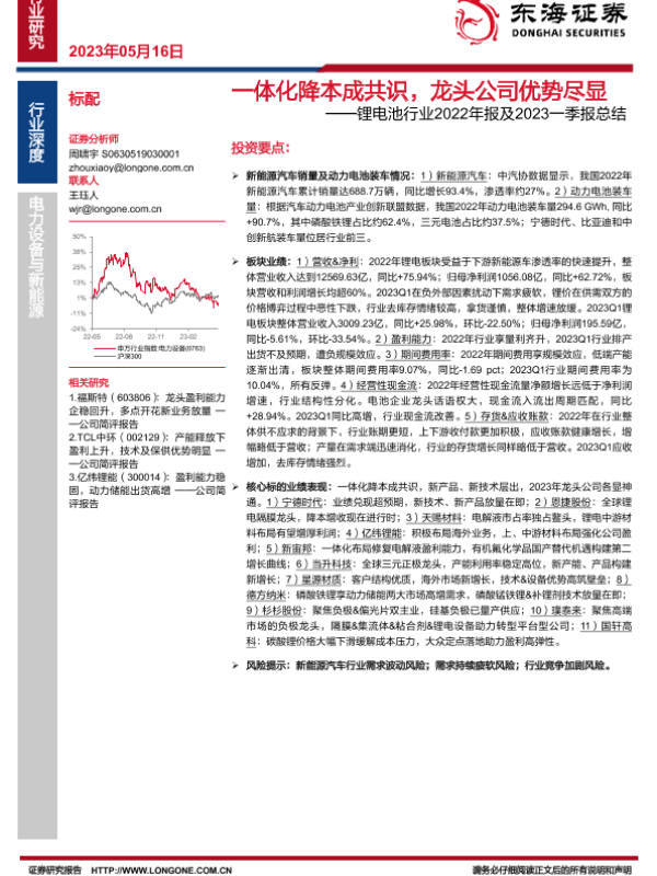【东海证券】【20230516】20230516-东海证券-锂电池行业2022年报及2023一季报总结:一体化降本成共识,龙头公司优势尽显-32页