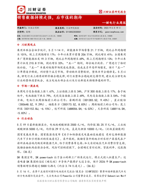 【川财证券】【20230519】20230519-川财证券-锂电行业周报:销售数据持续走强,后市值的期待-10页