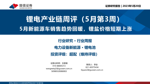 【国信证券】【20230520】锂电产业链周评(5月第3周):5月新能源车销售趋势回暖,锂盐价格短期上涨-17页