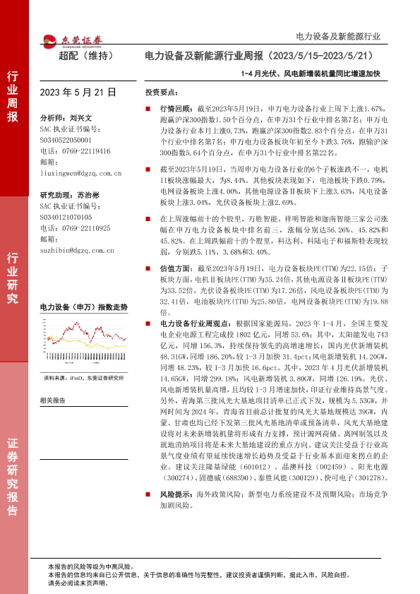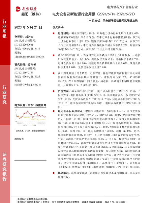 【东莞证券】【20230521】20230521-东莞证券-电力设备及新能源行业周报:1-4月光伏、风电新增装机量同比增速加快-16页
