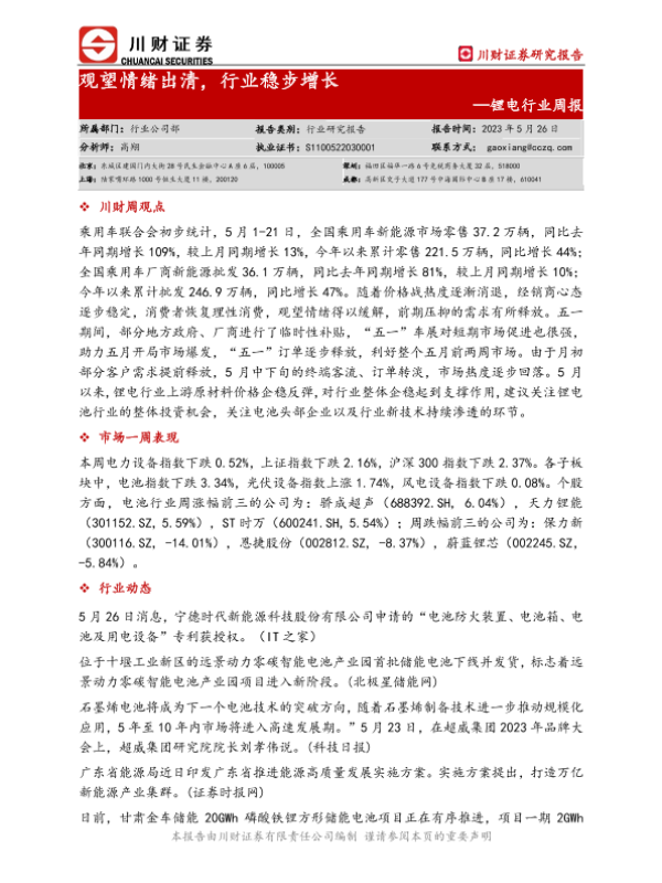 【川财证券】【20230526】20230526-川财证券-锂电行业周报:观望情绪出清,行业稳步增长-10页
