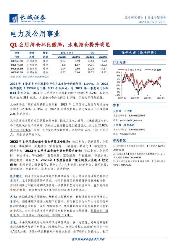 【长城证券】【20230529】20230529-长城证券-电力及公用事业行业专题报告:Q1公用持仓环比微降,水电持仓提升明显-10页