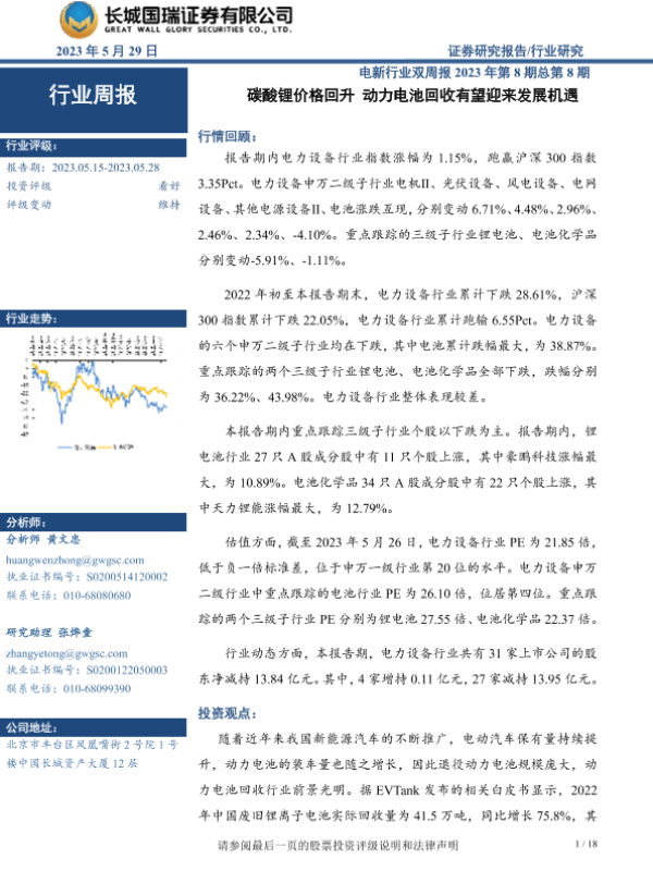 【长城国瑞证券】【20230529】电新行业双周报2023年第8期总第8期:碳酸锂价格回升 动力电池回收有望迎来发展机遇-18页