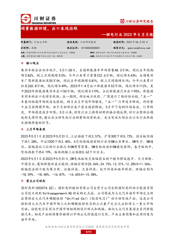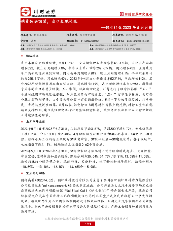 【川财证券】【20230602】锂电行业2023年5月月报:销量数据回暖,出口表现抢眼-11页