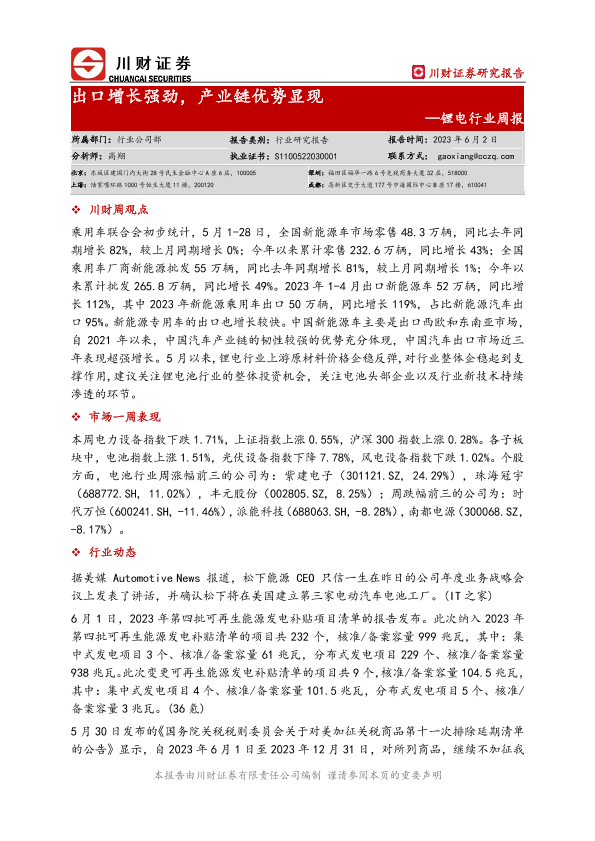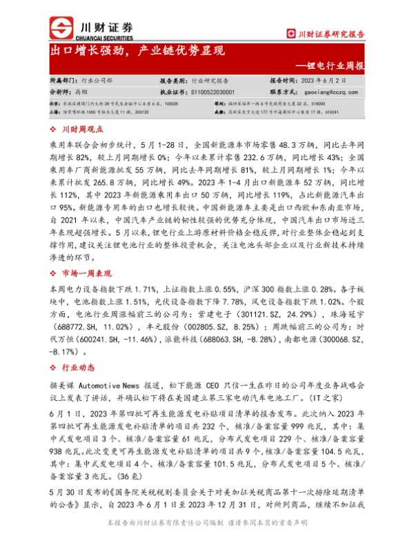 【川财证券】【20230602】20230602-川财证券-锂电行业周报:出口增长强劲,产业链优势显现-10页