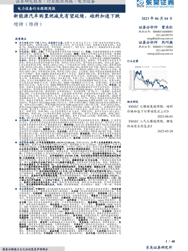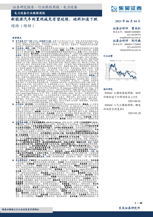 【东吴证券】【20230604】20230604-东吴证券-电力设备行业跟踪周报:新能源汽车购置税减免有望延续、硅料加速下跌-48页