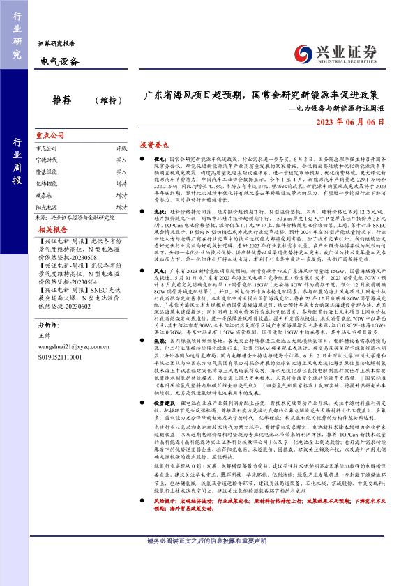 【兴业证券】【20230606】广东省海风项目超预期,国常会研究新能源车促进政策—电力设备与新能源行业周报-18页