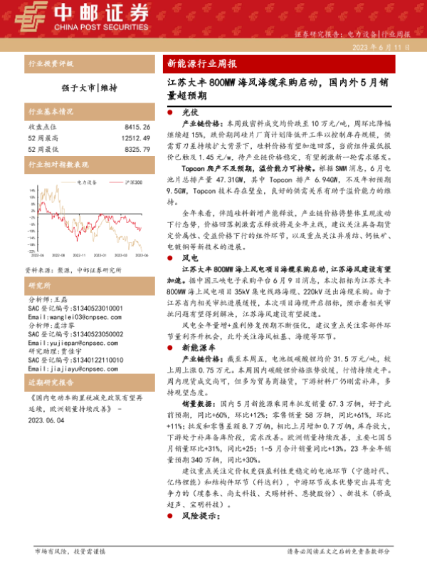 【中邮证券】【20230611】20230611-中邮证券-新能源行业周报:江苏大丰800MW海风海缆采购启动,国内外5月销量超预期-18页
