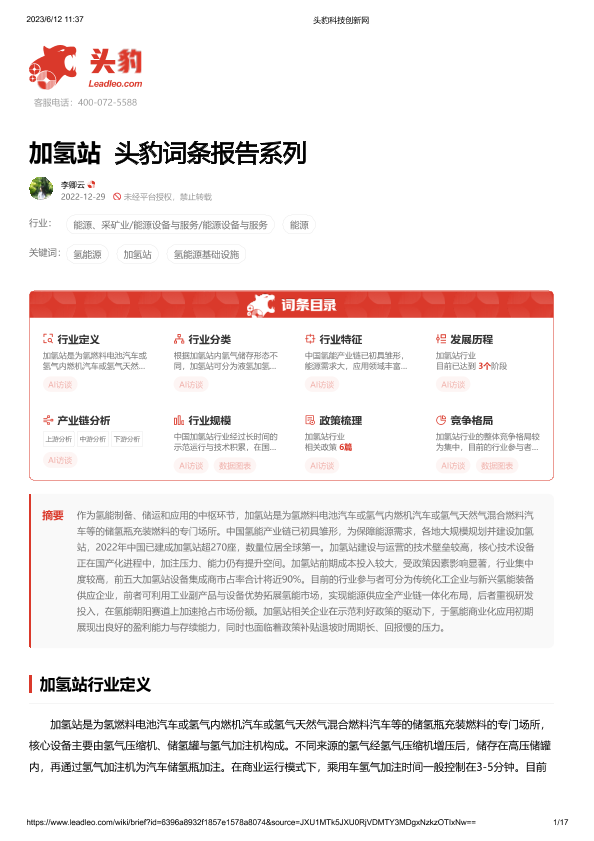 【头豹研究院】【20230612】加氢站 头豹词条报告系列-17页
