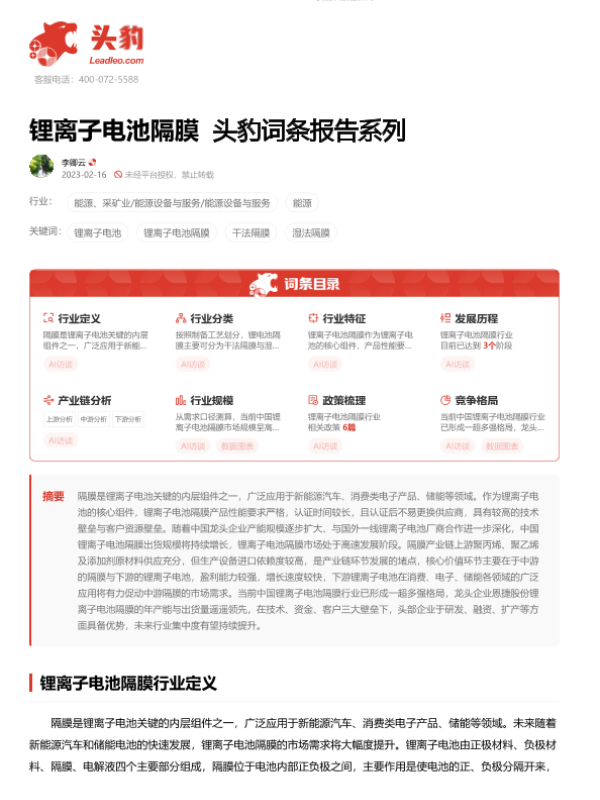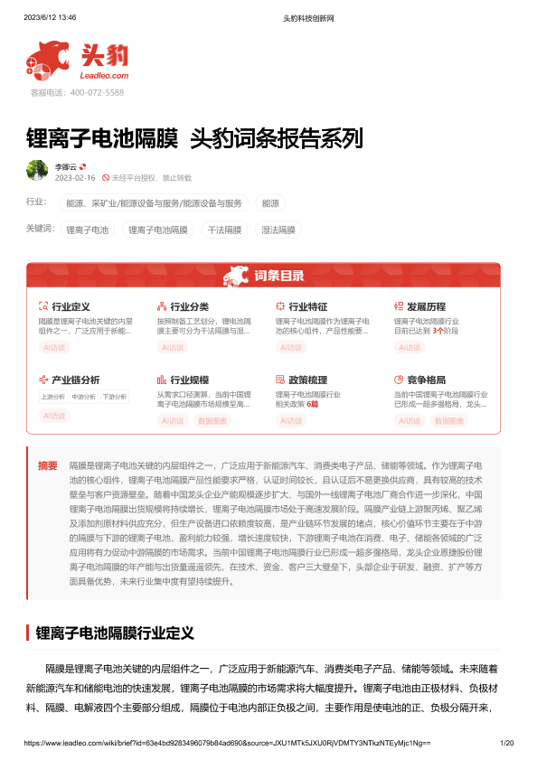 【头豹研究院】【20230612】锂离子电池隔膜 头豹词条报告系列-20页
