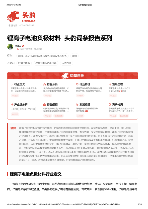 【头豹研究院】【20230612】锂离子电池负极材料 头豹词条报告系列-20页