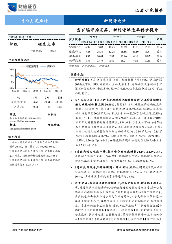 【财信证券】【20230615】20230615-财信证券-新能源电池行业月度点评:需求端开始复苏,新能源渗透率稳步提升-17页