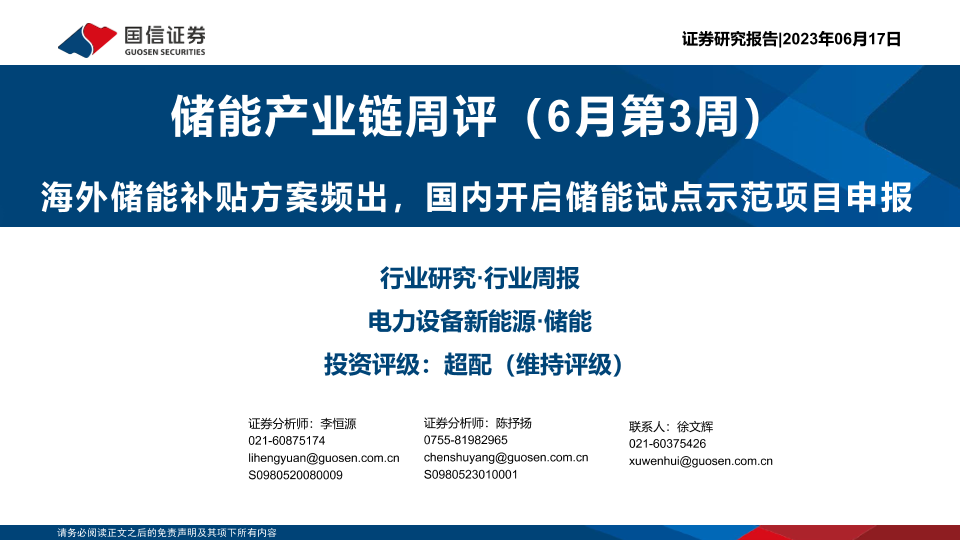 【国信证券】【20230617】20230617-国信证券-储能产业链周评(6月第3周):海外储能补贴方案频出,国内开启储能试点示范项目申报-28页