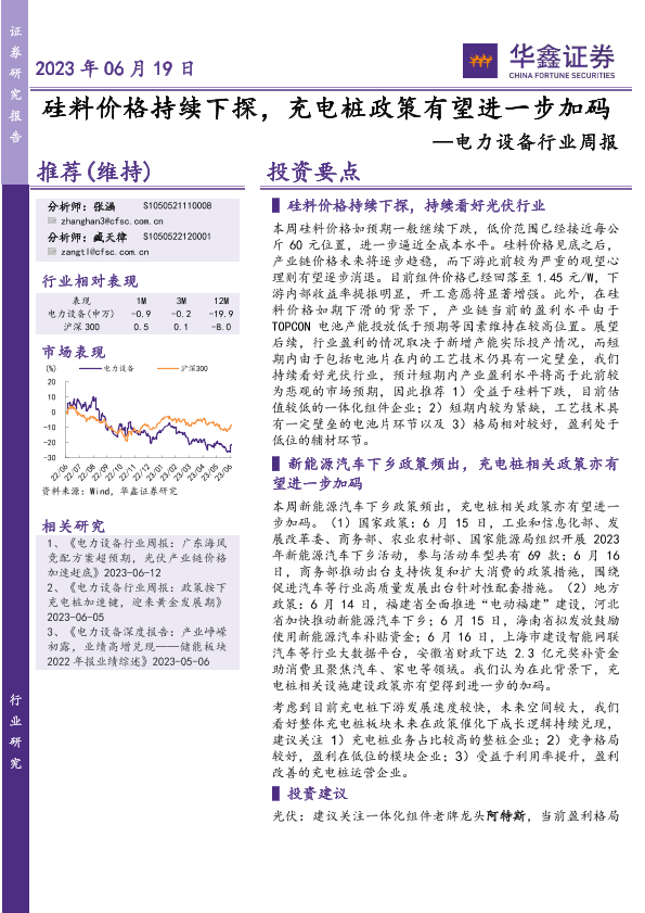 【华鑫证券】【20230619】20230619-华鑫证券-电力设备行业周报:硅料价格持续下探,充电桩政策有望进一步加码-20页