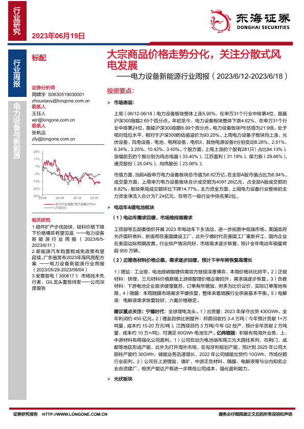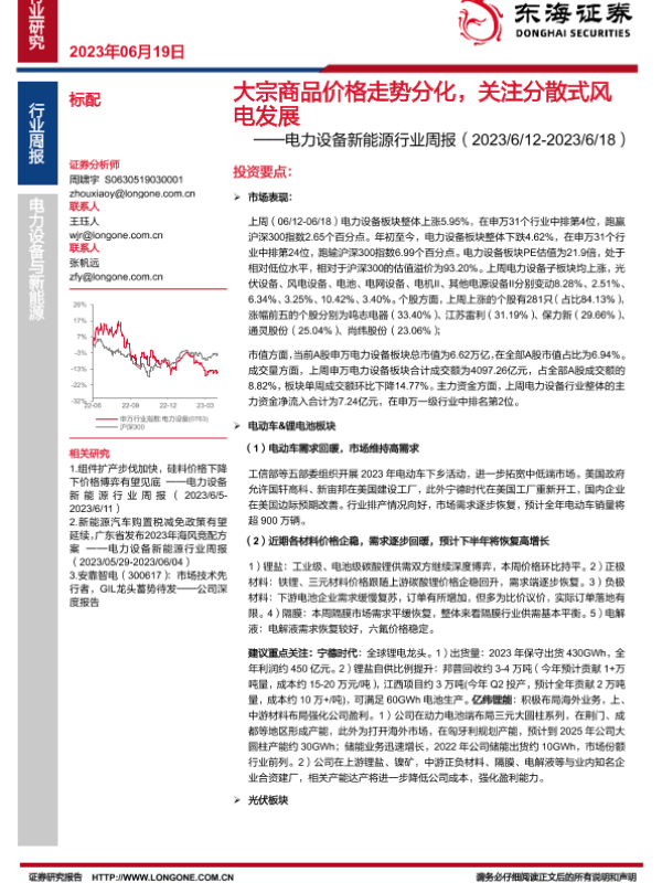 【东海证券】【20230619】20230619-东海证券-电力设备新能源行业周报:国内需求大宗商品价格走势分化,关注分散式风电发展-28页