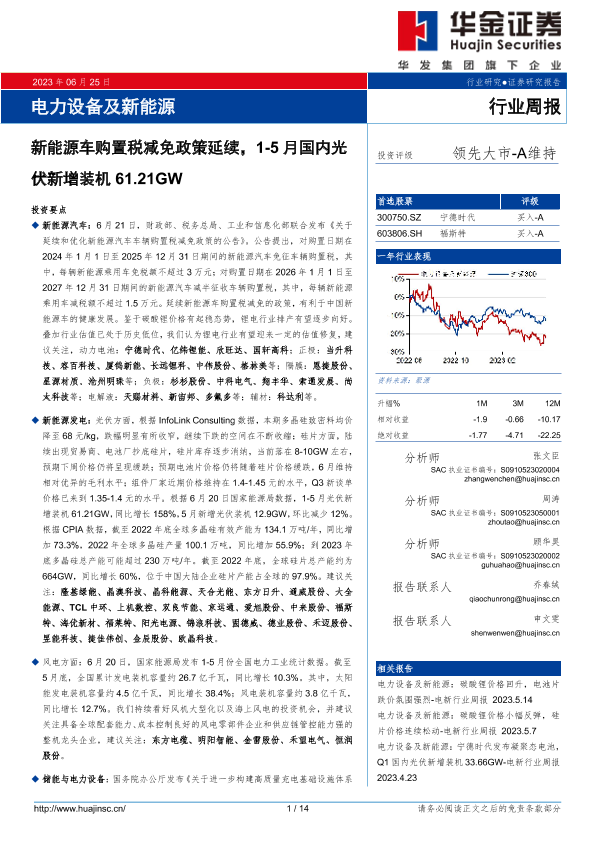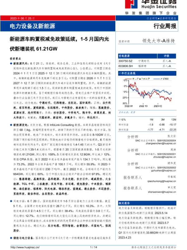 【华金证券】【20230625】电力设备及新能源行业周报:新能源车购置税减免政策延续,1-5月国内光伏新增装机61.21GW-14页