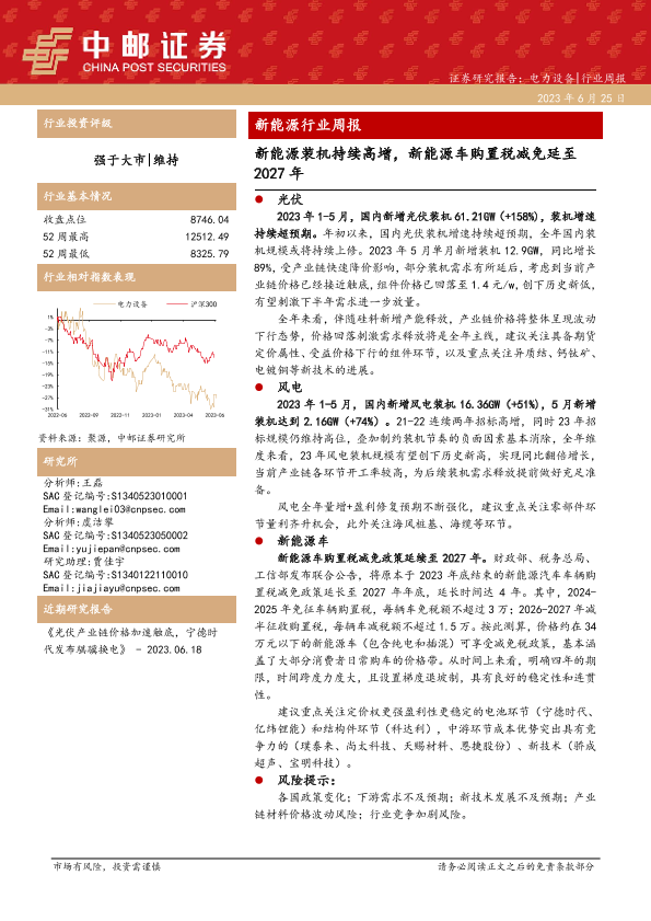 【中邮证券】【20230625】20230625-中邮证券-新能源行业周报:新能源装机持续高增,新能源车购置税减免延至2027年-17页