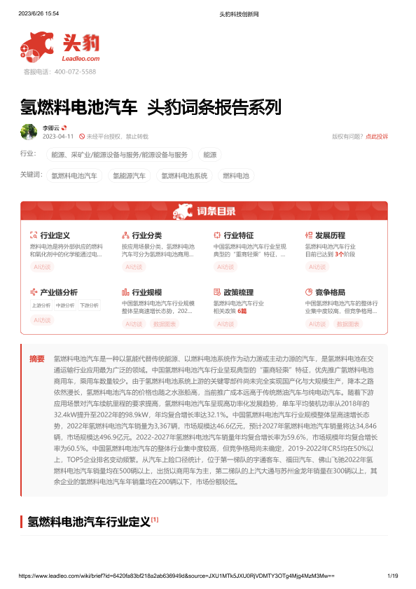 【头豹研究院】【20230626】氢燃料电池汽车 头豹词条报告系列-19页