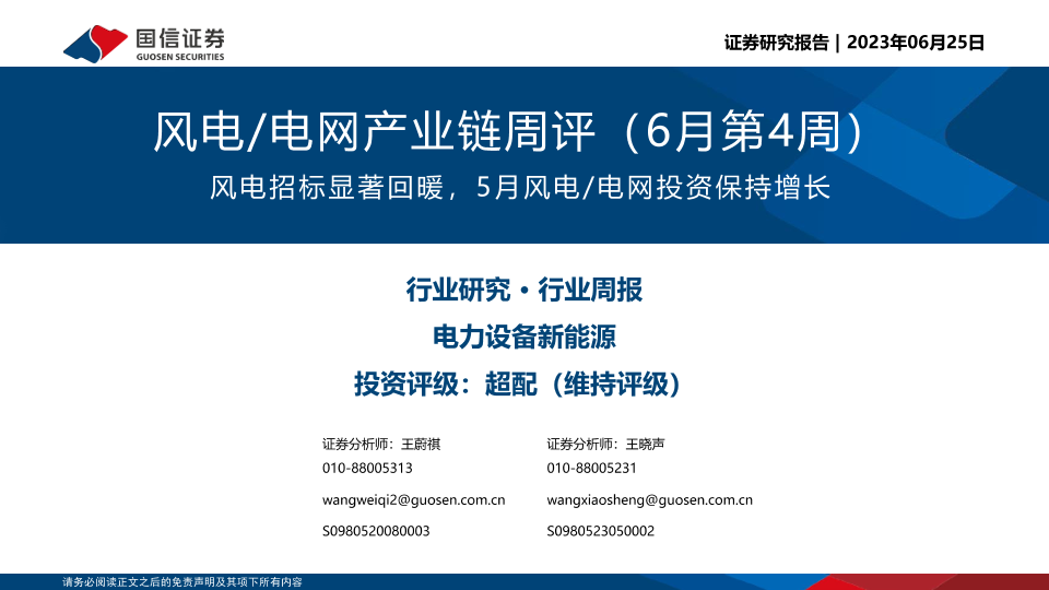 【国信证券】【20230625】风电/电网产业链周评(6月第4周):风电招标显著回暖,5月风电/电网投资保持增长-24页