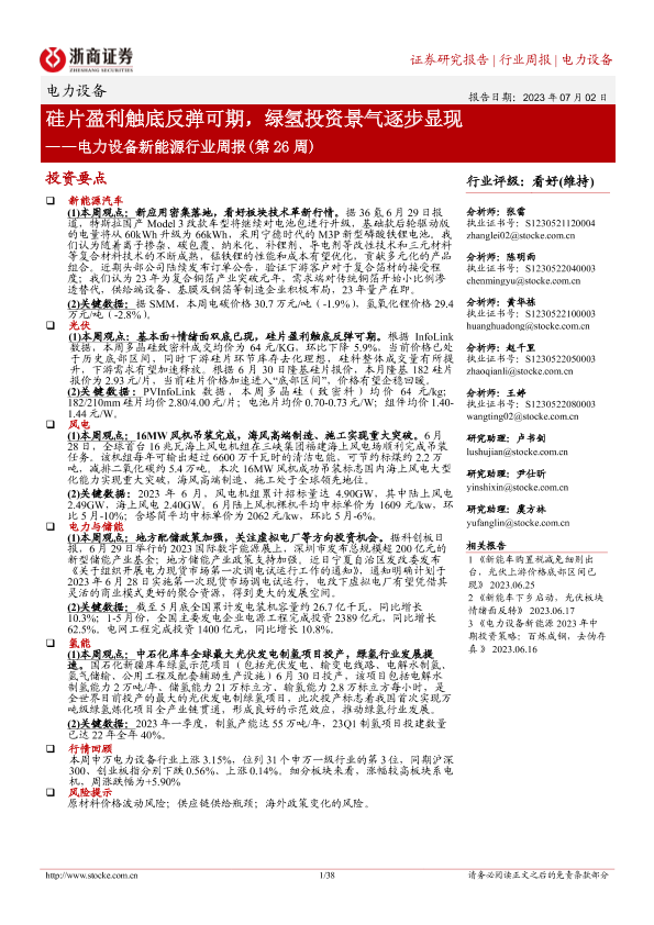 【浙商证券】【20230702】电力设备新能源行业周报(第26周):硅片盈利触底反弹可期,绿氢投资景气逐步显现-38页